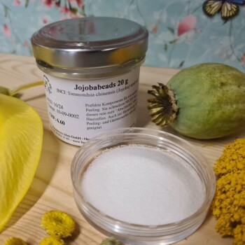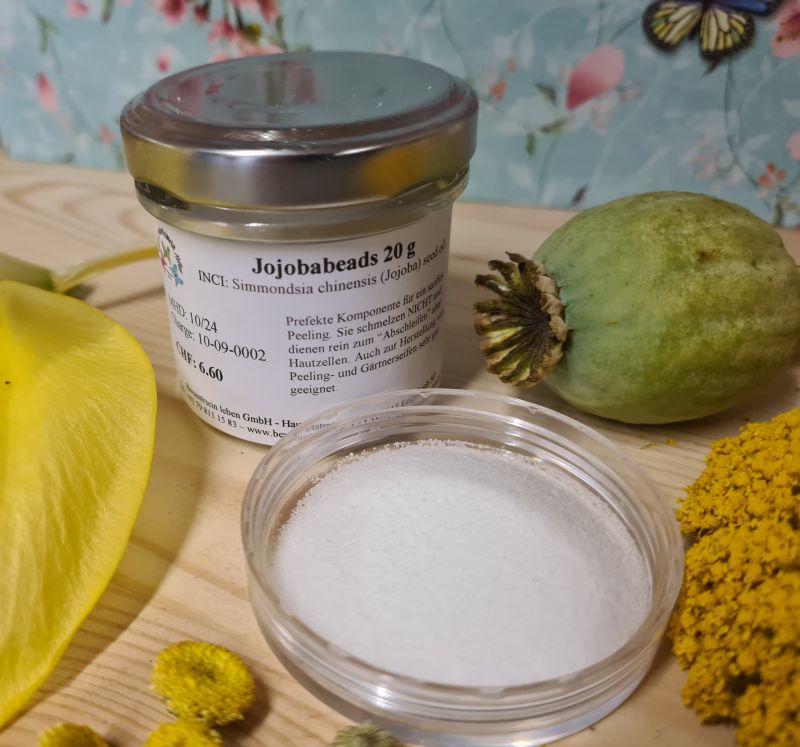 - Jojobabeads sind sehr sanfte Peeling-Granulate und eignen sich daher auch ausgezeichnet für Gesichtspeelings.