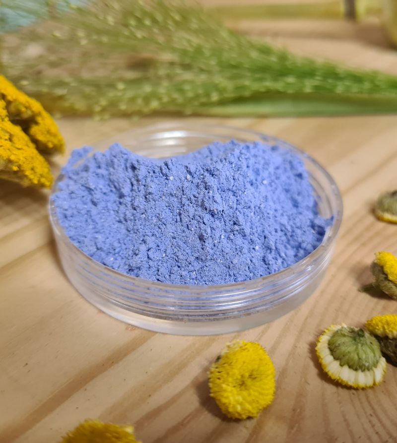 Bei der blauen Tonerde handelt es sich um eine Mischung aus Bolus Alba (Kaolin, weisser Lehm) und Ultramarin blau. Sie ist reich an Kieselsäure und Mineralsalzen. Sie ist weniger absorbierend als grüne Tonerde.