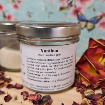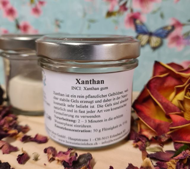 - Xanthan erzeugt ein trübes Gel mit schöner Konsistenz und ist optimal zum Verdicken von Lotionen, Zahncremen und Deos geeignet.