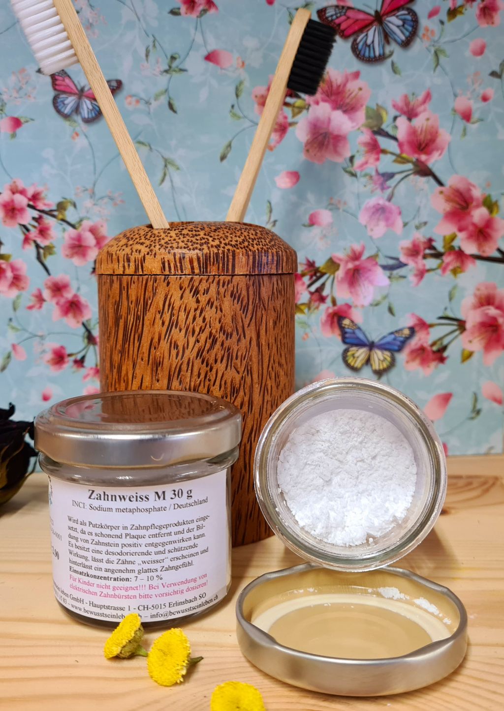 Zahnweiss ist ein unbedenkliches weisses, geschmacks- und geruchsneutrales Pulver (Salz der Phosphorsäure Na3PO4). In Kombination mit Bolus Alba (Kaolin, weisser Lehm), Schlämmkreide, Kieselsäure und Tonerden dient es als Abrasiv (Schleifmittel) in der Zahnpflege.